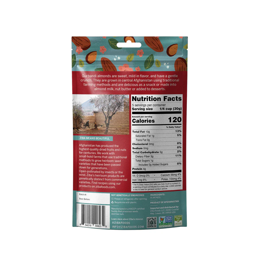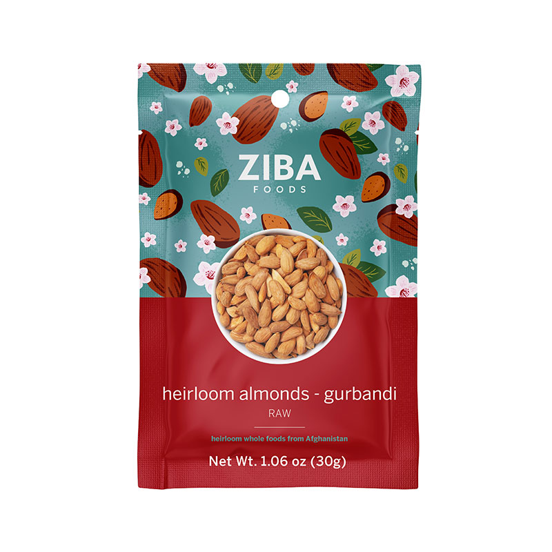 Gurbandi almonds are sweet, mild in flavor, and have a gentle crunch. They are grown in central Afghanistan using traditional farming methods and are delicious as a snack or made into almond milk, nut butter or added to desserts.
