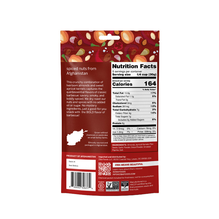 This crunchy combination of heirloom almonds and sweet apricot kernels captures the quintessential flavors of classic barbecue: savory, smoky, and boldly spiced. We dry roast our nuts and spices with no added oil or sugar.