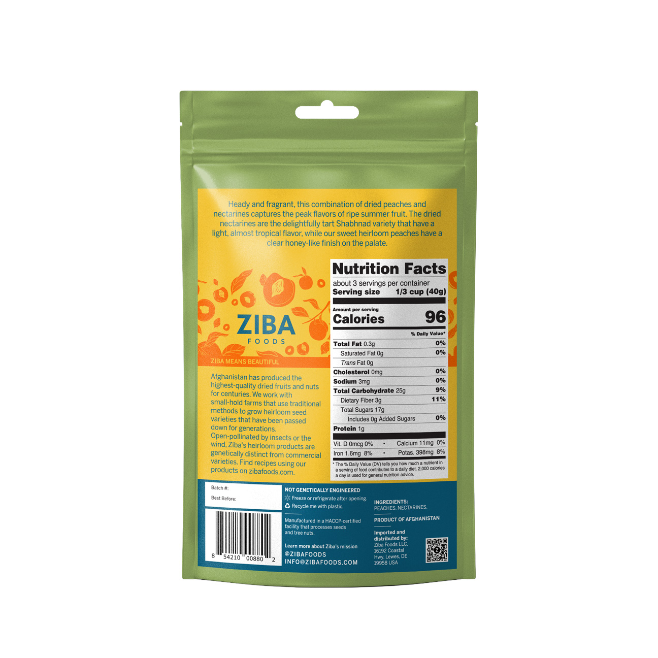 The dried nectarines are the delightfully tart Shabhnad variety that have a light, almost tropical flavor, while our sweet heirloom peaches have a clear honey-like finish on the palate.