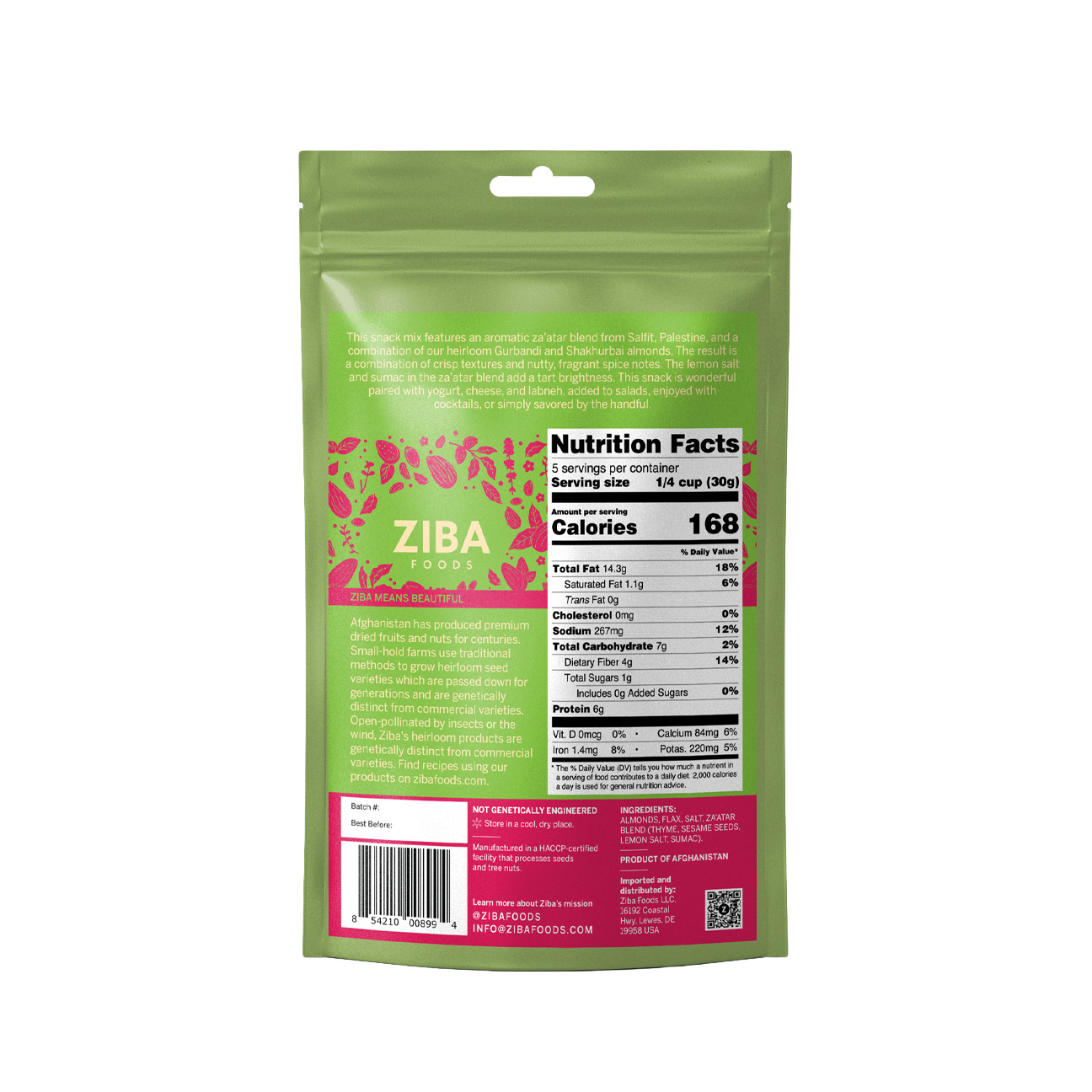 Almonds, Flax, Salt, Za'atar blend (Thyme, Sesame Seeds, Lemon Salt, Sumac).