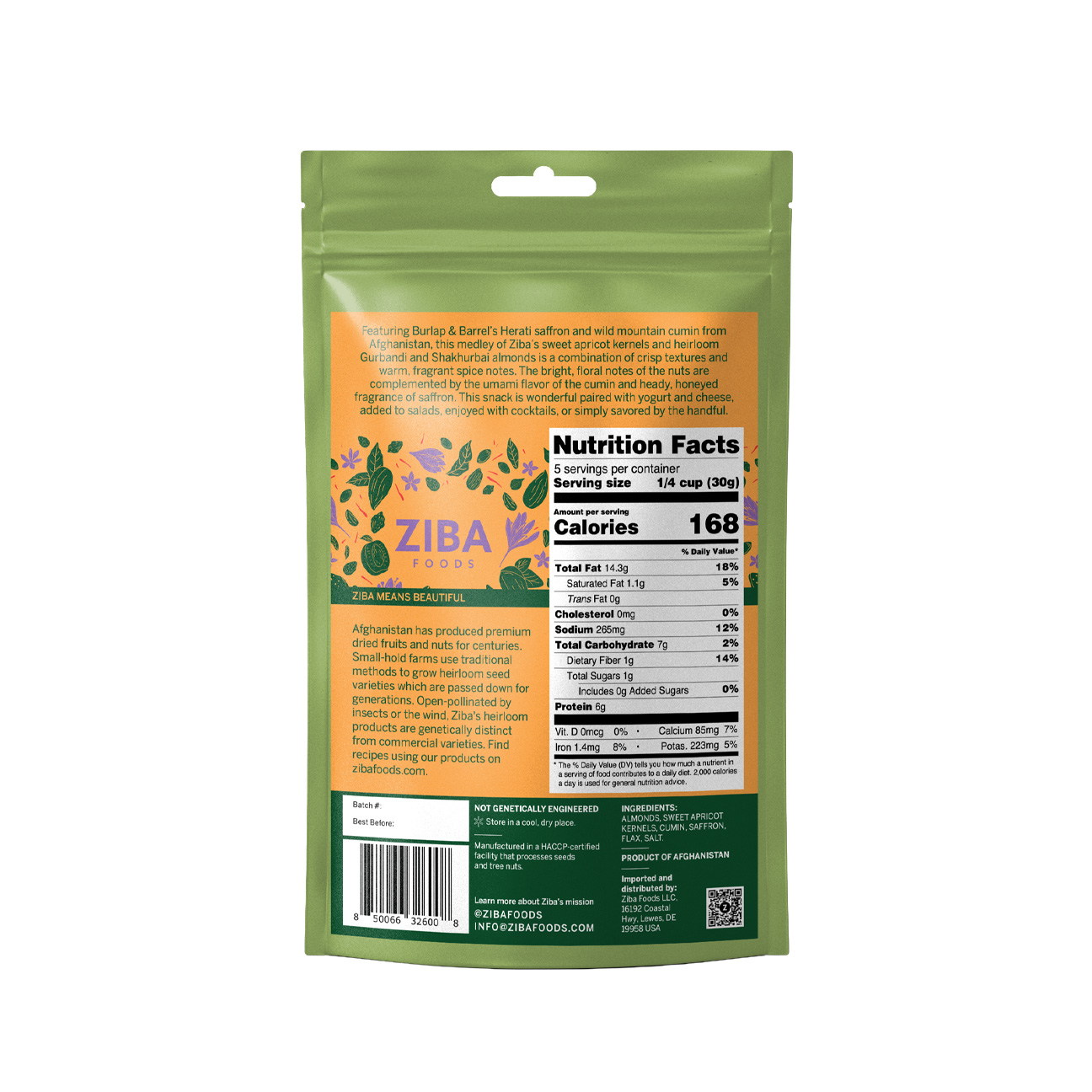 Almonds, Pistachios, Sweet Apricot Kernels, Cumin, Saffron, Flax, Salt.