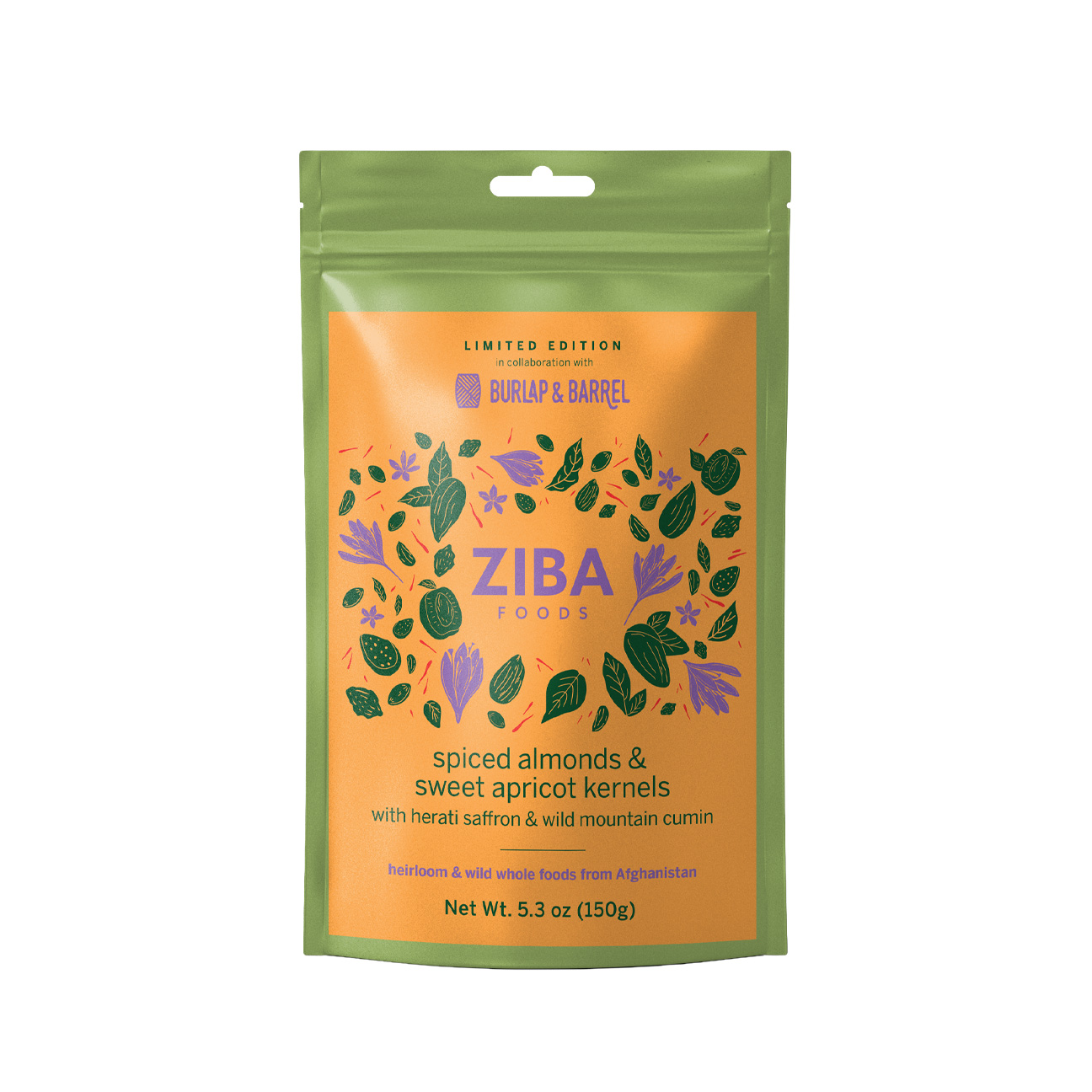 Featuring Burlap & Barrel’s wild mountain cumin and Herati saffron from Afghanistan, this medley of Ziba’s sweet apricot kernels and heirloom Gurbandi and Shakhurbai almonds is a combination of crisp textures and warm, fragrant spice notes. The bright, floral notes of the nuts are complemented by the umami flavor of the cumin and heady, honeyed fragrance of saffron. This snack is wonderful paired with yogurt and cheese, added to salads, enjoyed with cocktails, or simply savored by the handful.